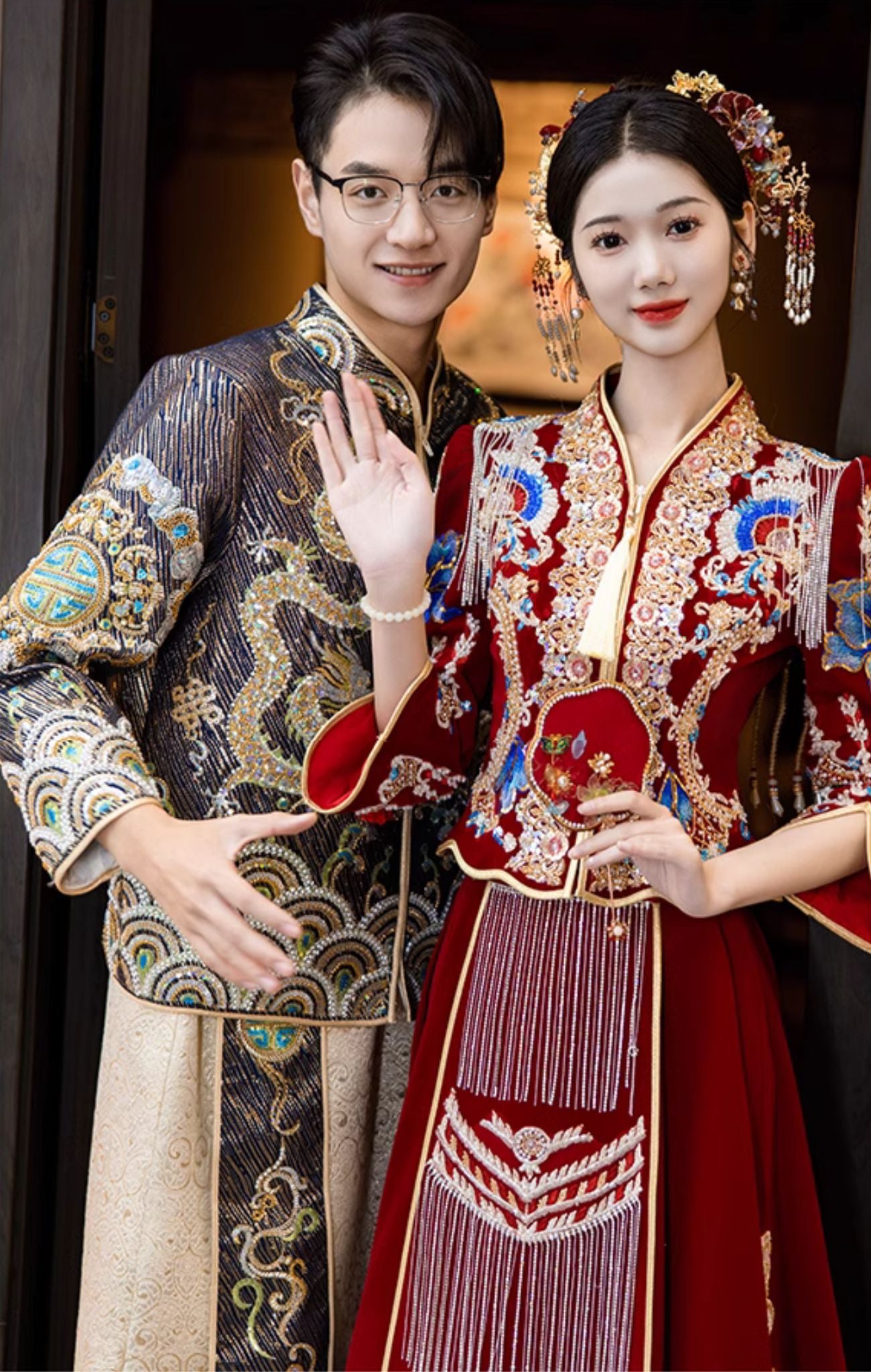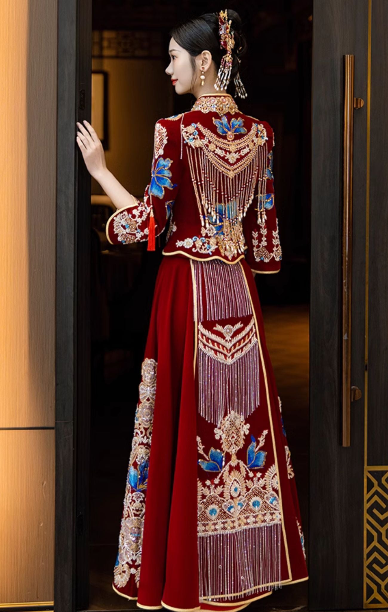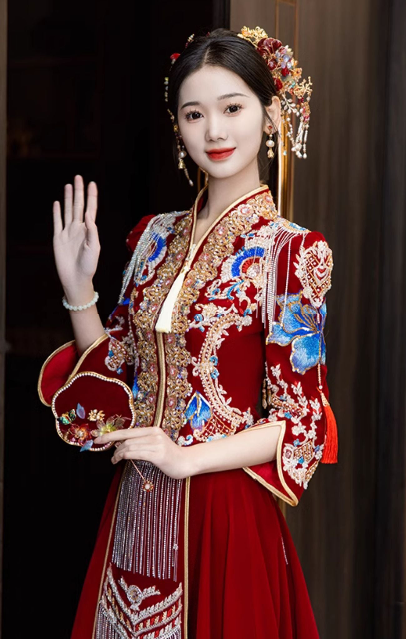 正红色丝绒秀禾服,珠绣与苏绣的完美结合